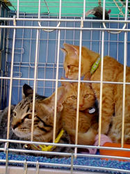 11/21/22:49 譲渡会行ってきました本日の譲渡会、今村、ビビリ、クロビビリの三匹で参加しました。 猫の参加が一般はわしらだけで、あとは主催のボランティアさんが二匹というミニマムな感じでごわした。 ボランティアのおねーすぁんに「譲渡会慣れしてきましたね♪」と言ってもらえましたぞ(^o^)! んと、まだ去勢OK貰ってないんです。たーぶーん、今月内か来月初めにはチョッキンできるはず。そのはず。 だって「11月には去勢できますよ」って先生言ってたもん。 五ヶ月半+去勢まだってのが、なかなか欠点でして。 ここまで大きくなるとダメぽかなぁという気にもなってきたり。 今後は今村一匹に絞ろうという方向性で家族会議はきまりました。 殿、それがし頑張るでし。