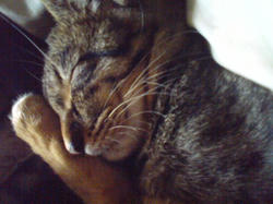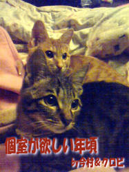 12/02/00:06 クロビ難の相通算三回目の脱走ではマミーがドーナツで釣り、クロビの足を踏んづけて捕獲。逃げないため70~80kgの体重を片足にかけたため、実際にクロビを捕まえる係りだった私はガブリと。 未だに利き手がなんだか痛い。捻挫みたいな痛み。 そして一昨日の脱走では、翌日に帰還したものの、ほぼずっと庭で泣きっぱなしという。 クロビ、トコトン暴れん坊な奴め。 写真は夜中~日中と庭で鳴き通しだったくせに、自力で家に戻ってご満悦な寝顔です。 清水もジジもクロビが帰った途端に舐める舐める。 この二匹の溺愛ぶりを見るとクロビは里子に出せそうにないなあ。 今村も果たして里子に出していいものか。 地方雑誌に募集かけたけど、掲載まで時間あるしなあ。 まあ、取らぬ狸の皮算用な気もしなくもないか。 今はサークルの原稿を考えようっと。まだ一枚も書いてない。ヤバイよう。 PR